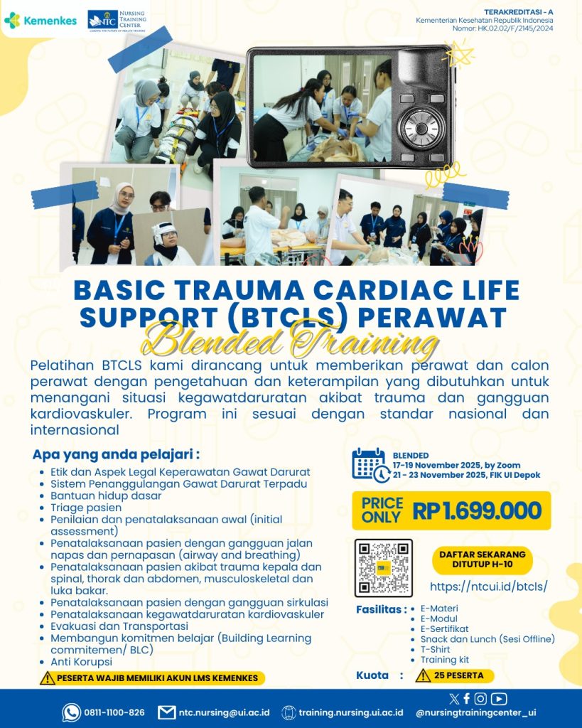 Pelatihan BTCLS kami dirancang untuk memberikan perawat dan calon perawat dengan pengetahuan dan keterampilan yang dibutuhkan untuk menangani situasi kegawatdaruratan akibat trauma dan gangguan kardiovaskuler. Program ini sesuai dengan standar nasional dan internasional.